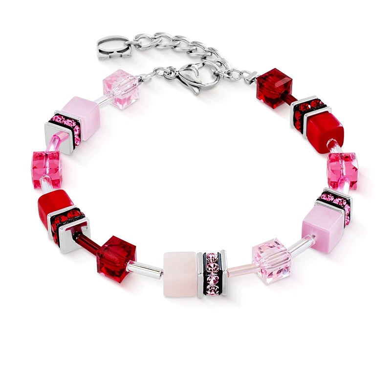 A rózsaszín GeoCUBE® Iconic karkötő egy stílusos, modern, grafikus megjelenésű karkötő. A felismerhető GeoCUBES ikonikus megjelenést kölcsönöz a karkötőnek. A lágy rózsától a mélyebb vörösig terjedő színátmenet meleg, nőies hatást kelt, míg a letisztult vonalak modernné teszik az egészet.