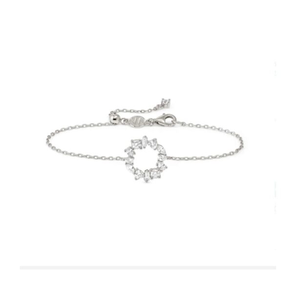 Ez a modern ezüst karkötő elegáns megjelenést és kifinomult részleteket kínál minden alkalomra. A ragyogó fehér cirkónia kövek finoman kiemelik a karkötő letisztult formavilágát, miközben időtálló csillogást biztosítanak. Ez a karkötő tökéletes választás azok számára, akik a modern, mégis egyedi ékszereket részesítik előnyben. Ideális mindennapi viselethez és különleges alkalmakra egyaránt.