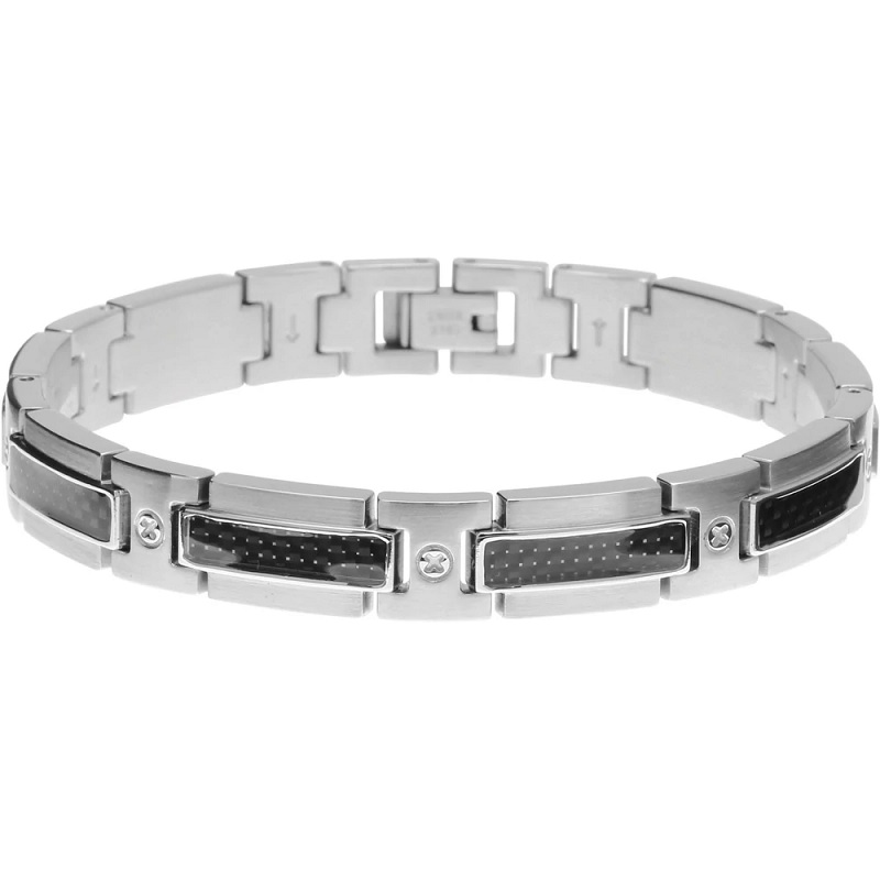 Klasszikus, férfias és divatos egyszerre – francia acél ékszerek minőségi kidolgozással. Ezüst színű acél karkötő fekete karbon mintázatú díszítéssel, pattintós zárral. A karkötő hossza 21 cm, szélessége 10 mm. A karkötő hosszúsága szakszervizben, csatszem kiszedésével állítható.