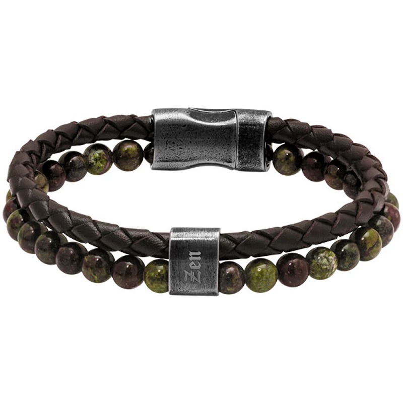 Klasszikus, férfias és divatos egyszerre – francia acél ékszerek minőségi kidolgozással. Barna fonott bőr és ásványi kőzet karkötő 7 mm-es zöld jáspis gömbökkel. A karkötő hossza 21 cm, szélessége 13 mm. Antikolt hatású fekete színű acél mágneses zárral, és gravírozott kiegészítéssel, felirata: ZEN.