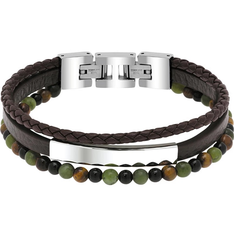 Többszálú fonott bőr és hasított bőr karkötő ásványi kőzet kiegészítéssel: 4 mm-es zöld színű jáspis és barna tigrisszem gömbökkel. Ezüst színű acél pattintós zárral, és gravírozásra is alkalmas acél betéttel. A karkötő hossza 19,5 cm, melyből egy darab kb. 1 cm-es zár-rész kivehető, ezzel a karkötő mérete csökkenthető. A bőrszálak szélessége: 3 és 5 mm.