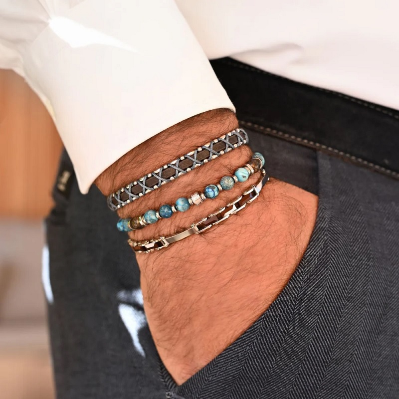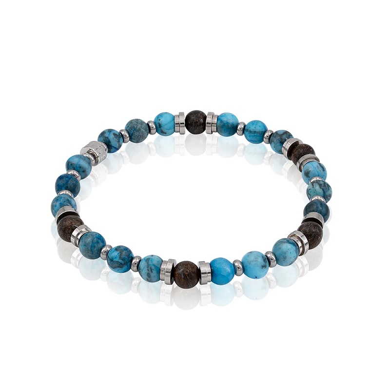 A BALOS Lagoon érintetlen fehér homokja és élénk kékeszöld vize ihlette ezt a karkötőt, amely megragadja a trópusi árnyalatok lényegét. A bronzit gyöngyök földhözragadt, magabiztos hangulatot kölcsönöznek, így tökéletesek számos alkalomra. Különböző formájú és méretű fényes acél díszítések teszik teljessé ezt a játékos, mégis kifinomult megjelenést.