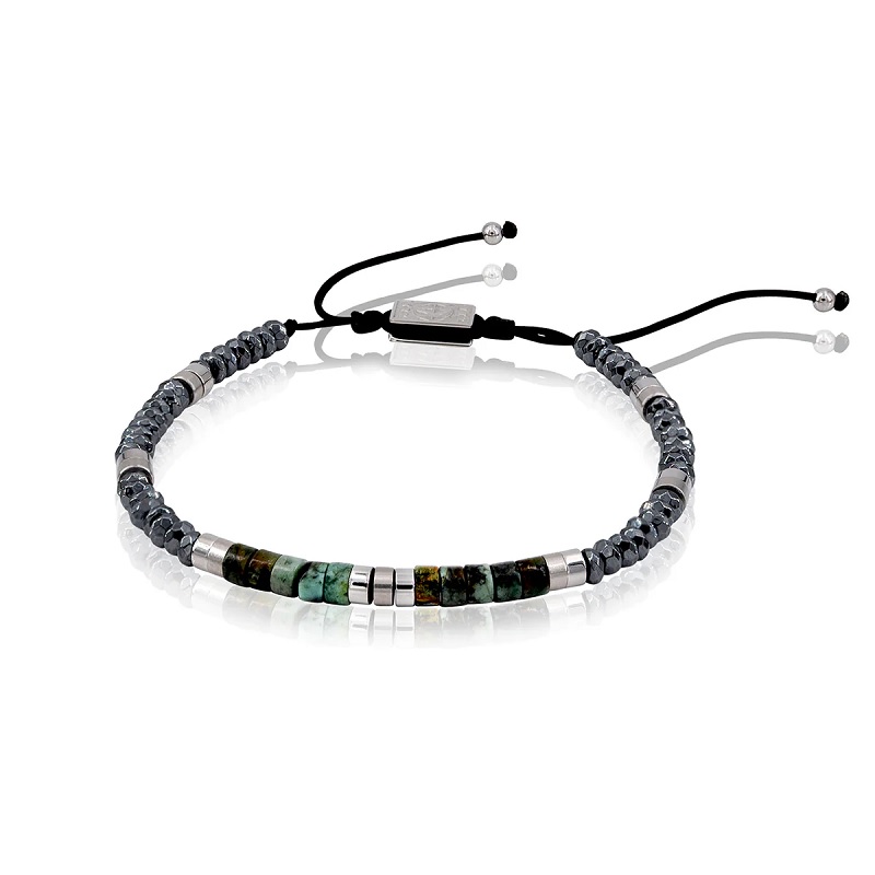 A JUNIPERUS Forest karkötő nevét és ihletét Kréta tengerparti dűnéiből kapta. Lenyűgöző afrikai türkiz hengereket ábrázol, melyek élénkzöld és mélyzöld színekben pompáznak, csillogó, csiszolt hematit gyöngyökkel párosítva. Az állítható csúszócsomó kényelmes illeszkedést biztosít bármilyen csuklóra, így tökéletes választás napsütéses tengerparti kalandokhoz vagy elegáns városi estékhez.
