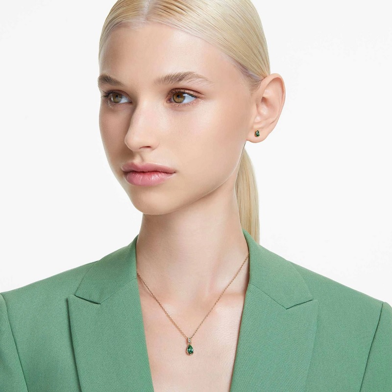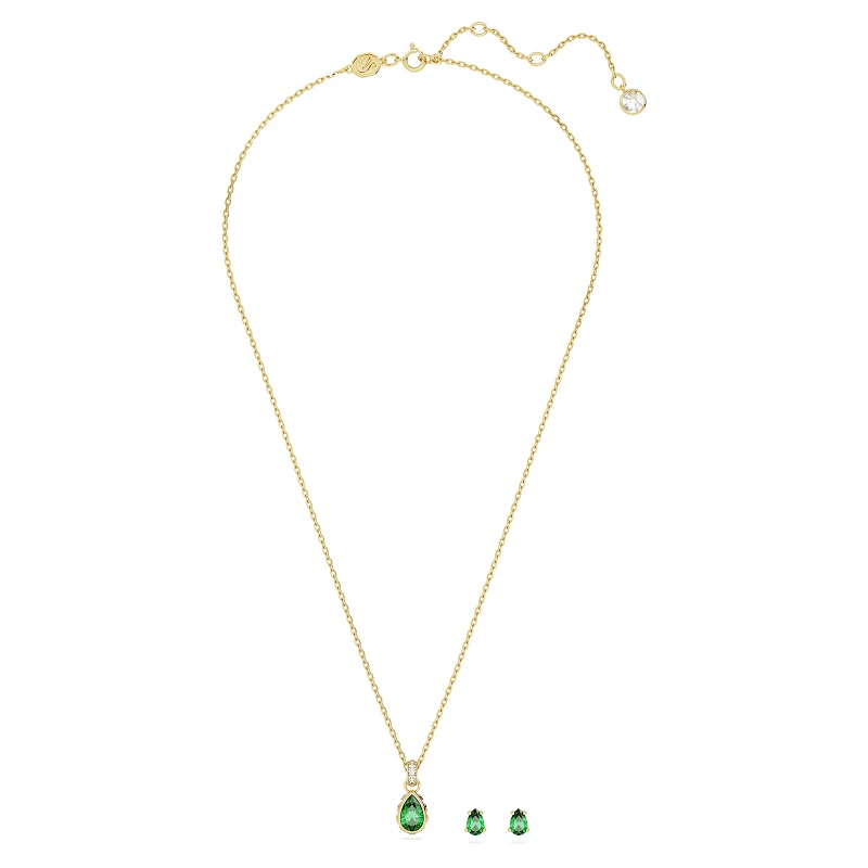 Ez a Chroma családból származó, ragyogó ékszerszett tökéletes a kifinomult megjelenéshez. Az aranytónusú bevonattal ellátott darabok körtecsiszolású zöld köveket, és négyzet alakú, tiszta kristályokat tartalmaznak. Finom, de erőteljes módja az elegancia fokozásának, és bármilyen megjelenésedbe színt visz.