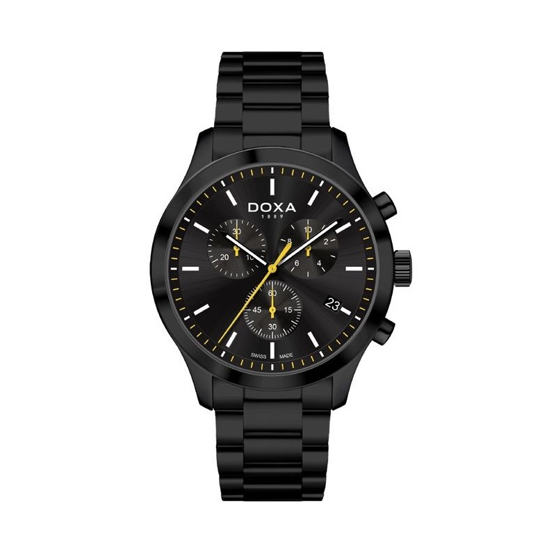 A belépő szintű svájci márkák körében nagy népszerűségnek örvend a Doxa. Már nagyszüleink idejében is megvolt a maga státuszszimbóluma ami a mai napig töretlen. A Doxa D-Chrono 1657008115 vagány és fiatalos külsővel rendelkezik. Trendiségét a fekete és citromsárga színek kombinációja adja ami az óra több pontján megjelenik. A segédkörök mutatói, a precindexek és a stopper másodperc mutatója is sárga színben pompázik. 45mm széles rozsdamentes acél tokját fekete PVD bevonat borítja, ami fokozottan ellenáll a kopásnak.