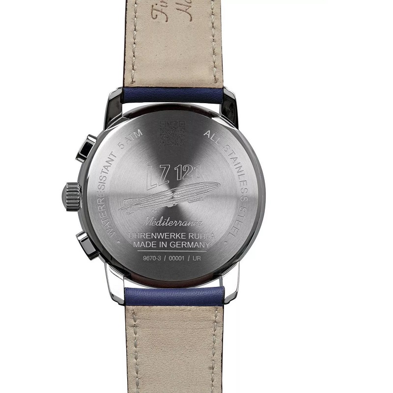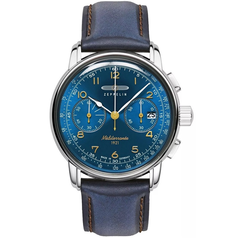 A Zeppelin Mediterranee Chronograph 9670-3 férfi kvarcóra Miyota 6S21 óraművel. A modellt a tengerészkék számlap különbözteti meg, amely kronográf funkcióval és hó-nap időzítővel rendelkezik, ami növeli a praktikusságát. Az ezüstszínű rozsdamentes acél borítás kék bőrszíjjal kerül szembe, elegáns kombinációt alkotva. Az ásványi üveg védi a számlapot, az 50 méteres vízállóság pedig megvédi az órát a kisebb fröccsenésektől.
