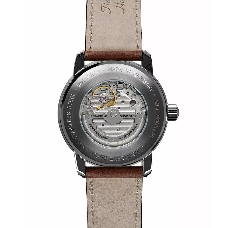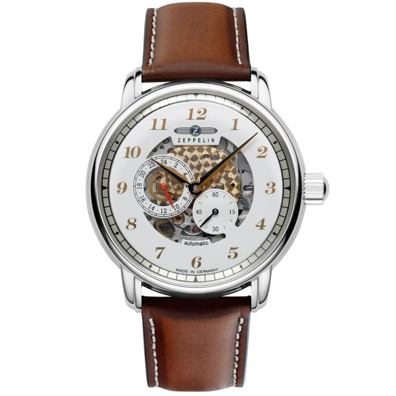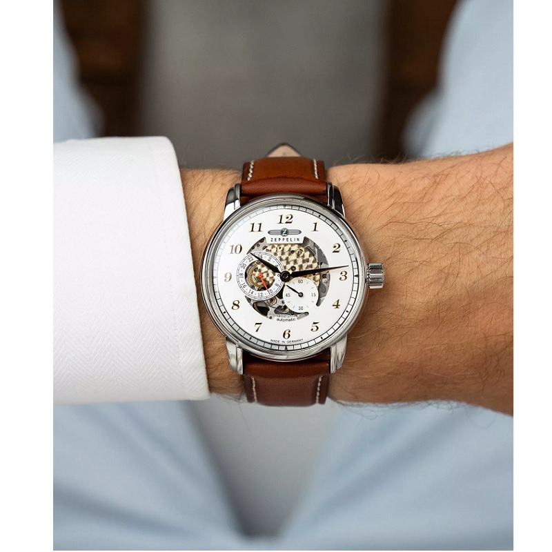 A Zeppelin New Captain’s Line Automatic 8658-1 férfi karóra egy klasszikus retro stílusú modell, amelyet a repülési órák hagyományai ihlettek. A 42 mm átmérőjű boríték rozsdamentes acélból készült, és barna bőrszíjjal párosul. Belsejében a Miyota 82S7 automata szerkezet működik, amely az üvegezett lünettán keresztül látható, lehetővé téve a működésének megfigyelését. A számlap a Captain’s Line kollekcióra jellemző esztétikában maradt meg, ötvözve az eleganciát és a funkcionalitást. A teljes tokot edzett ásványi üveg védi. Az 50 méteres vízállóság a fröccsenések elleni védelemért felel, így a modell tökéletes a mindennapi használatra.