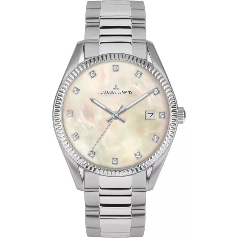 A Jacques Lemans 50-4H a Derby kollekcióból egy elegáns női kvarcóra, amely luxus dizájnjával tűnik ki. Az ezüst színű tok és a szíj 316L rozsdamentes acélból készült, IP-bevonattal a tartósság és a kifinomult stílus érdekében. A gyöngyházszínű számlap finom bájt kölcsönöz, és tökéletesen kiegészíti az ezüstszínű kivitelezést. Az óra a hozzáadott funkcionalitás érdekében havi dátummal és lumineszcens bevonattal van ellátva. Az ásványi edzett üveg megvéd a karcolásoktól, és a 100 méteres vízállóságnak köszönhetően az óra praktikus és ideális a mindennapi használatra.