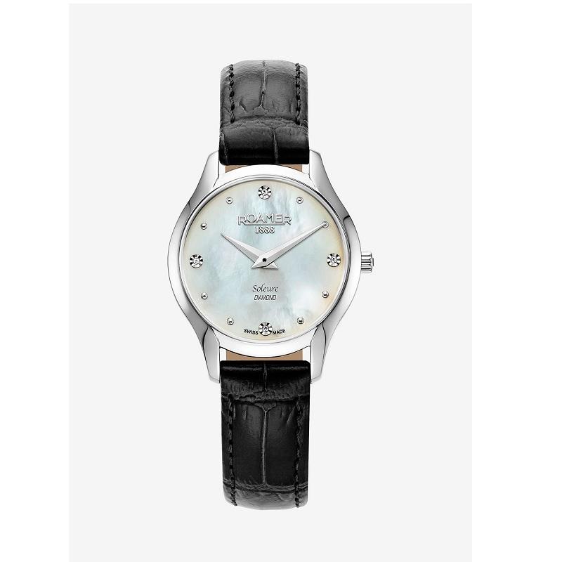 A valódi gyémántok varázslatos csillogása egy csillogó gyöngyház számlapon az új SOLEURE DIAMOND-ot minden nő csuklóján szemet gyönyörködtető, nemes kiegészítővé varázsolja. De ennél többről van szó: a beépített, precíz, svájci gyártmányú kvarc 2 órás szerkezetű Ronda-762E-A2 olyan pontosan méri az időt, ahogy csak szeretné.