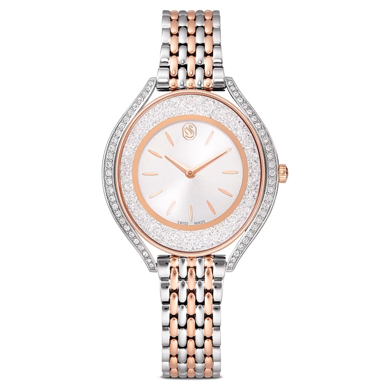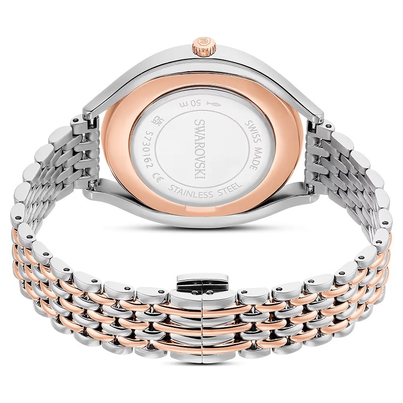 Ez az ívelt, kristályos karóra művészien ötvözi az eleganciát és a funkcionalitást. Körülbelül 1380 kristály díszíti a kétszínű dizájnt, amely rozsdamentes acél és rozéarany árnyalatú kidolgozást ötvöz. A kifinomult darabot fém szíj, ezüstös napsugár számlap és a 12 óránál látható Swarovski hattyú teszi teljessé. Ez a svájci gyártmányú óra 50 méterig vízálló.