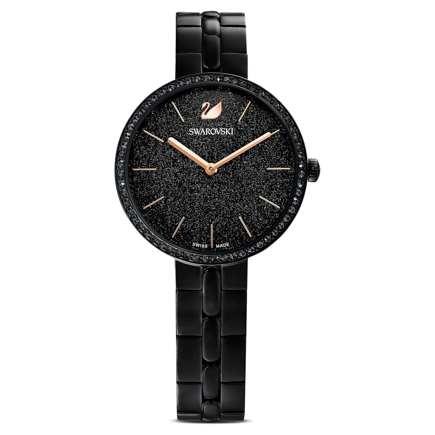 Divatos, fényes, lezser: ezt a trendi Swarovski órát csillogó kristályok díszítik. A rozéarany árnyalattal bevont mutatók ízléses kontrasztot alkotnak a fekete árnyalatú PVD-vel bevont nemesacél tokkal és óraszíjjal, valamint a ragyogó fekete óralappal. Az óra foglalatát tündöklő pavé díszíti, sziporkázóvá téve külsejét bármilyen alkalomról is legyen szó. Ez a svájci óra ideális kiegészítője a lezserül divatos öltözékeknek.