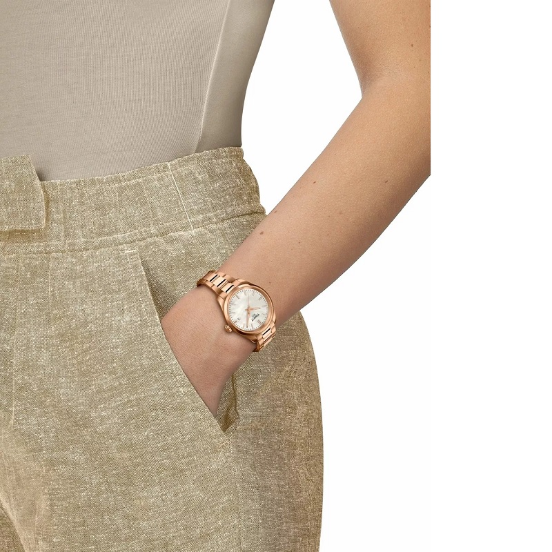A Tissot PR 100 T150.210.33.111.00 óra a klasszikus stílust ötvözi a modern funkcionalitással. A 34 mm átmérőjű burkolat és a karperec rozsdamentes acélból készült és PVD bevonattal ellátott rózsaaranyból készült. A gyöngyházszínű számlap kiemeli a modell elegáns jellegét, a lineáris indexek és a Super-LumiNova bevonatú mutatók pedig megkönnyítik az idő leolvasását különböző fényviszonyok között. Az óra svájci gyártású kvarcművel és kiváló minőségű zafírkristályüveggel van felszerelve. A 100 méteres vízállóság lehetővé teszi a biztonságos használatot úszás közben is. A modellhez 2 év garancia jár.